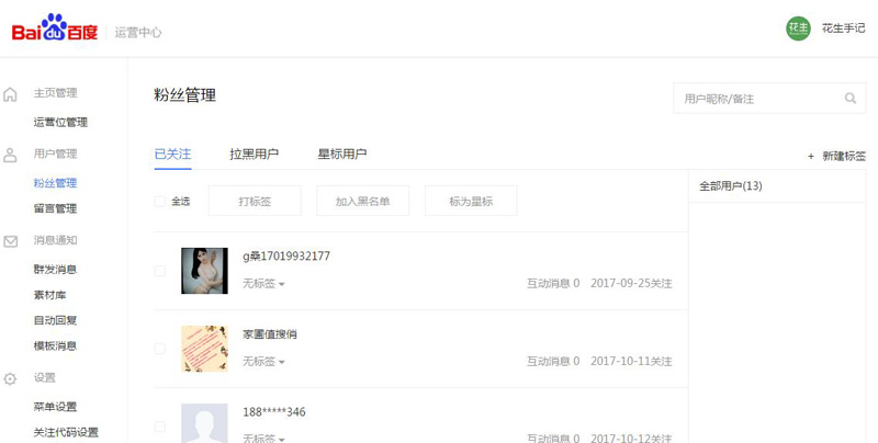 點擊運用中心可以直接進入對應“百度公眾號”的管理后臺,這里可以操作的內(nèi)容比較多,有管理用戶、查看留言、群發(fā)消息、設置菜單等等,看上去和微信公眾號后臺有些相似,大家可以自己去感受一下。