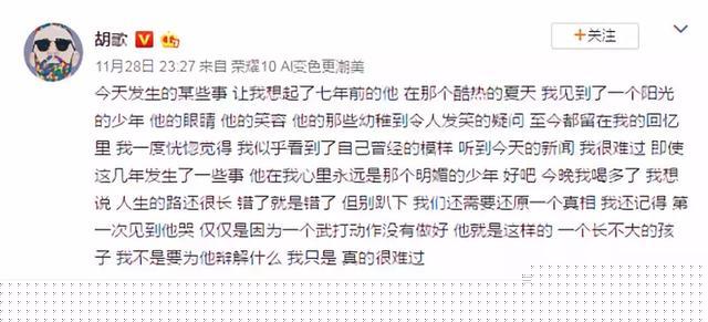 而當(dāng)天晚上,胡歌也就因家暴而陷入丑聞危機(jī)的蔣勁夫發(fā)表言論,字里行間全是憶往昔歲月,朋友義氣滿躍屏幕,之后許多明星轉(zhuǎn)發(fā)并效仿此寫法,結(jié)果不料遭到反噬,被網(wǎng)友指責(zé)“錯(cuò)了就是錯(cuò)了,別趴下”,這也是一種明星藝人沒有明確違法行為是錯(cuò)誤的態(tài)度而導(dǎo)致的。