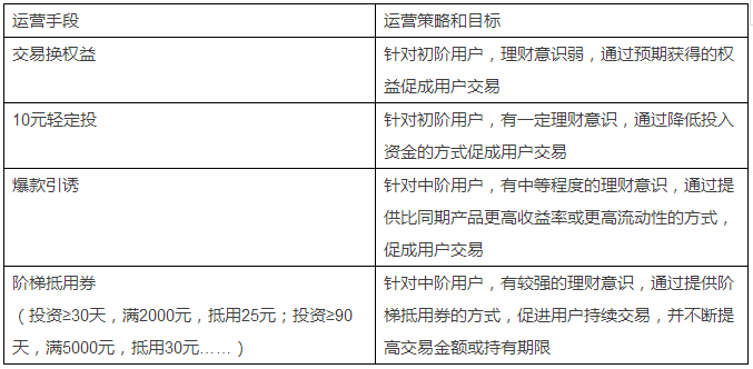 引導(dǎo)用戶完成這幾次交易的主要方式,就是“產(chǎn)品分類引流+運(yùn)營手段促成”,基于平臺(tái)現(xiàn)有的產(chǎn)品類別,以各種運(yùn)營手段配合,促成用戶完成多次復(fù)投,在多種產(chǎn)品之間流轉(zhuǎn),最終配置多種類型的產(chǎn)品。