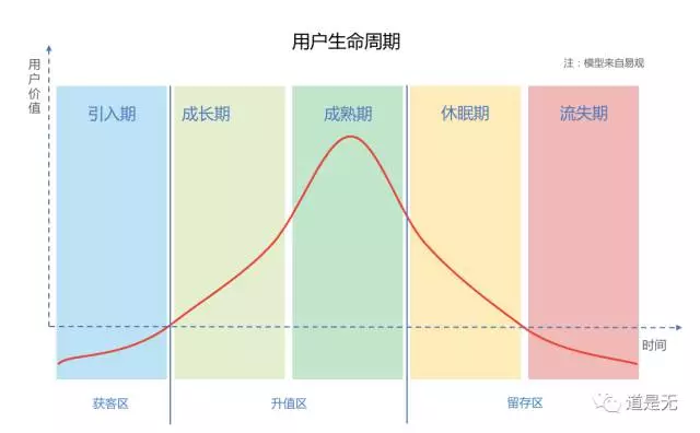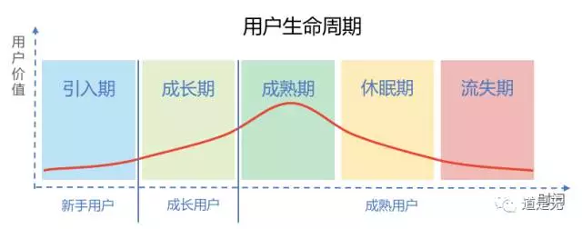 用戶生命周期通常分為五個(gè)階段,分別為:引入期、成長期、成熟期、休眠期、流失期。