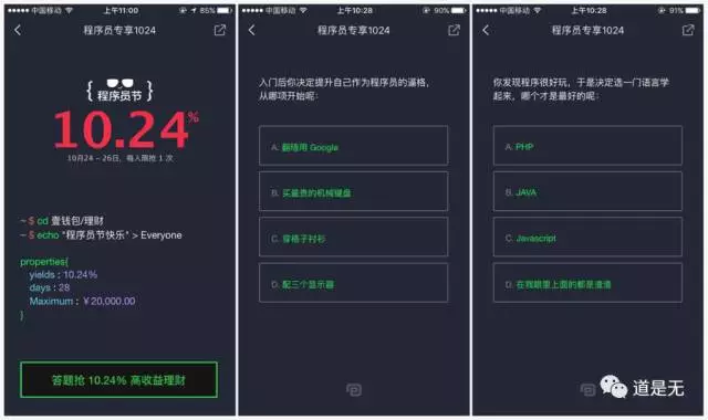 預(yù)算不足創(chuàng)意補(bǔ)。抓節(jié)日、跟熱點(diǎn)都屬于常規(guī)打法了。以平安壹錢包的1024程序員理財(cái)節(jié)為例。這個(gè)活動(dòng)的玩法是:用戶通過登錄頁面完成針對程序員的一系列題目,就能夠獲取購買年化收益率高達(dá)10.24%的專屬理財(cái)產(chǎn)品。