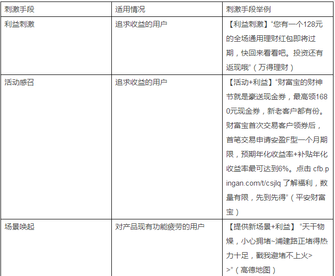 運(yùn)營手段多種多樣,本文所舉例證大多是基于“利益激勵(lì)”型案例,花費(fèi)較高,收效也比較明顯,包括送體驗(yàn)金、送券、送話費(fèi)、分享加收益等。除此之外,運(yùn)營手段還包括推送、內(nèi)容運(yùn)營、社群運(yùn)營等手段,這些手段在運(yùn)營中也同樣重要。