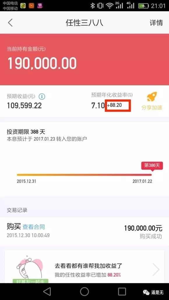 - 為了防羊毛黨薅羊毛,后來緊急上線了新規(guī)則,限定可加速收益的本金最高10萬,超過10萬的部分不能參加收益加速