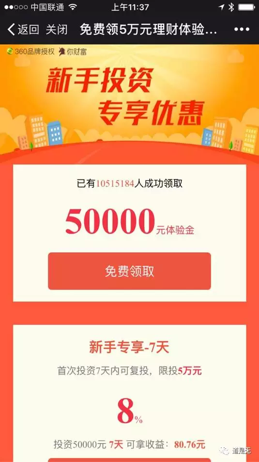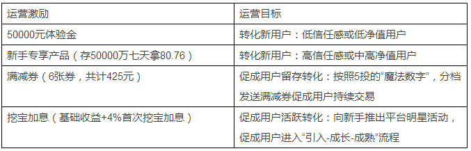在運(yùn)營KPI的主導(dǎo)下,基本各大平臺(tái)都有自己的一整套新用戶轉(zhuǎn)化手段。在此以360你財(cái)富為例來說明。你財(cái)富針對新手用戶(未投資用戶)提供如下組合禮包: