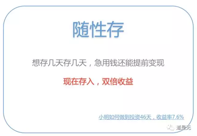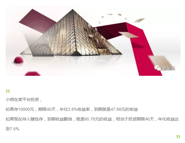 - Step4、妮妮在完成支付后,習(xí)慣到“我的理財(cái)”界面中看看新完成的交易情況。在產(chǎn)品列表中,又在廣告區(qū)看到了“隨性存”的展示,這次她注意到了“小明如何做到投資46天,收益率7.6%”這句話,感到很有意思,于是點(diǎn)擊了鏈接,看到如下圖文結(jié)合內(nèi)容:
