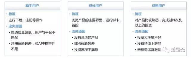 - 成長用戶:這時(shí)用戶對產(chǎn)品有了基本的認(rèn)知,正在進(jìn)行投資準(zhǔn)備工作(綁卡)或已經(jīng)完成首投。這時(shí)發(fā)生流失,原因一般是: