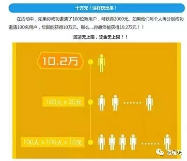 基本的邏輯是用戶邀請新用戶進(jìn)來,不但可以獲得獎(jiǎng)勵(lì),而且新用戶再邀請其他的新用戶進(jìn)入平臺(tái),還能繼續(xù)分得獎(jiǎng)勵(lì)金。