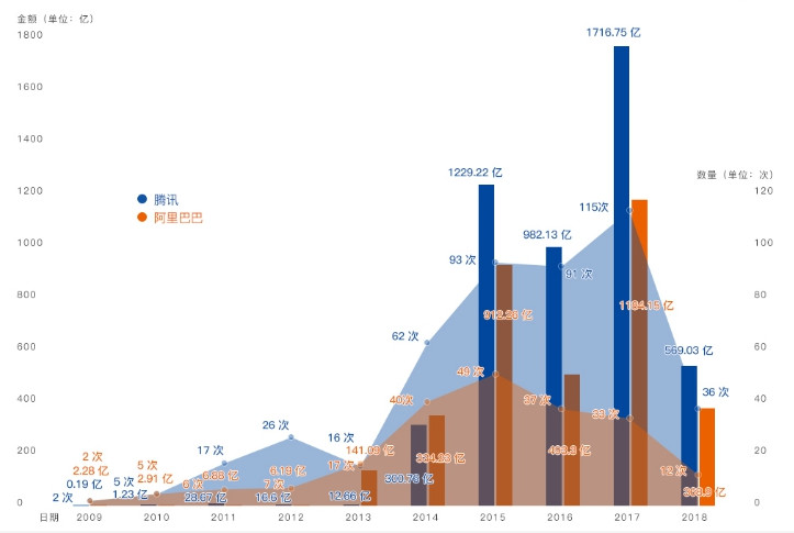 鈦媒體在2017年末做了一個阿里騰訊投資數(shù)據(jù)表,并分析得出: