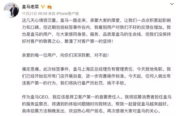 11月21日,盒馬“標(biāo)簽門”事發(fā)4天后,盒馬CEO侯毅在社交媒體發(fā)布致歉信。
