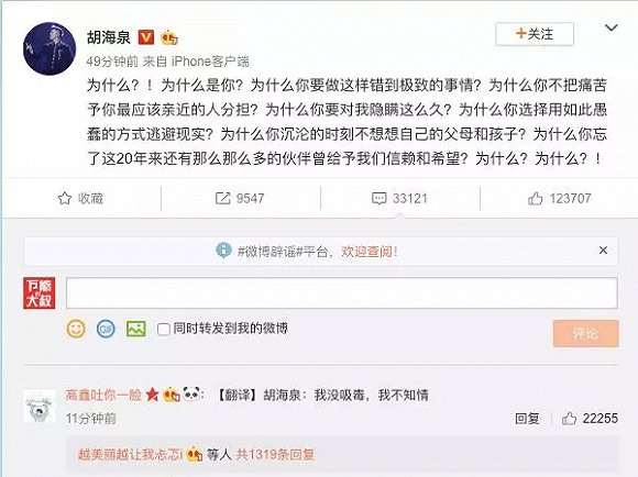 剛剛,胡海泉發(fā)微博發(fā)出10個為什么?從表面上看,這是對合作多年朋友干出這種事的惋惜,實際傳遞了兩個核心信息:“我沒吸毒,我不知情”。