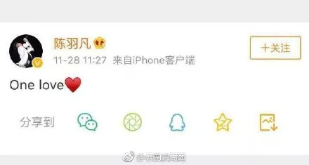 3、最關(guān)鍵的來了,一個多小時后,今天上午11時27分,陳羽凡的個人微博更新,并寫道:“One love ”。以此行為來為自己吸毒被抓的事辟謠。