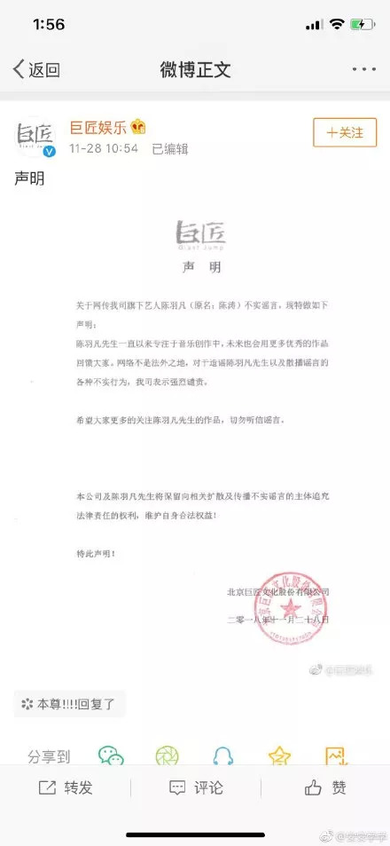 2、今天上午10點,陳羽凡的公司@巨匠娛樂 發(fā)表聲明,否認網(wǎng)曝關(guān)于陳羽凡的不實傳聞,稱:“陳羽凡先生一直專注于音樂創(chuàng)作中。”并表示“對于造謠陳羽凡先生以及散播謠言的各種不實行為,我司表示強烈譴責。”