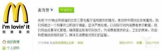 那是一個(gè)微博剛出現(xiàn)沒多久的時(shí)間點(diǎn),人們更多的還是習(xí)慣從第二天的報(bào)刊電視看企業(yè)的回復(fù)。但是麥當(dāng)勞卻利用了微博,在晚會(huì)結(jié)束一小時(shí)后就交出了第一份聲明,強(qiáng)調(diào)企業(yè)對這個(gè)事件的重視。
