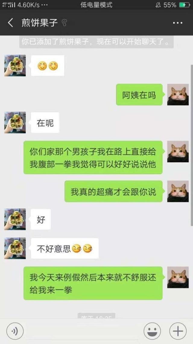 女生加上學(xué)校食堂阿姨后直接投訴被她家的孩子打了一拳,關(guān)鍵這一拳還是無緣無故毫無理由的那種,再加上女生的身體也不舒服,自然是痛到不行了,阿姨也是連連道歉表達(dá)自己的歉意,這現(xiàn)在的熊孩子腦回路不知道都是什么,無緣無故給人家肚子來一拳,這都是什么操作?