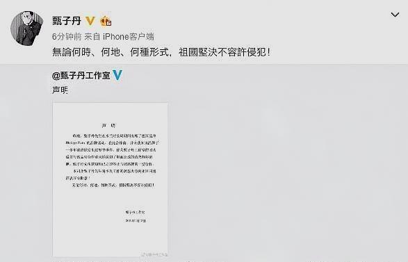 甄子丹也轉(zhuǎn)發(fā)該聲明,表示“無(wú)論何時(shí)、何地、何種形式,祖國(guó)堅(jiān)決不容許侵犯!”