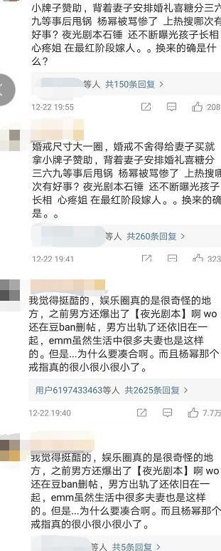 “公開戀情時有膽氣,分開后未來更精彩”的好聚好散派、“恭喜楊冪脫離苦海”的祝福派、以及拿“婚戒尺寸、夜光劇本”等劉愷威負面新聞佐證楊冪值得更好的的“心疼派”比比皆是,甚至不乏同樣的話術出現(xiàn)在不同微博下并分別成為熱門評論。