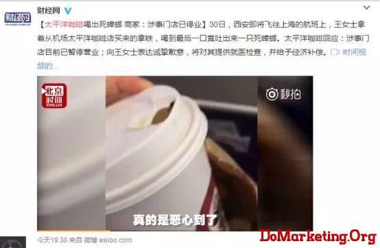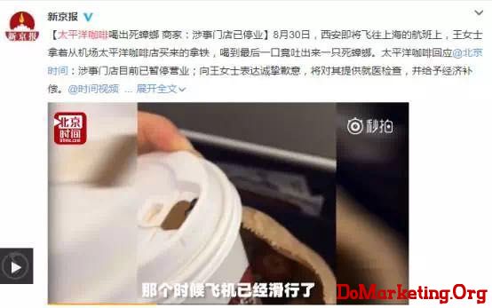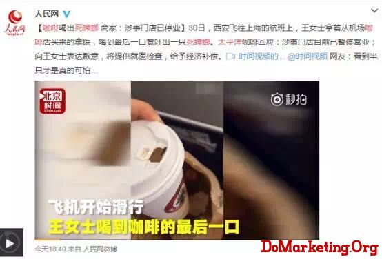 但是這份與海底撈態(tài)度相同的說明,并沒有給太平洋咖啡的公關(guān)帶去同樣的結(jié)果。在太平洋咖啡發(fā)出說明之后,人民網(wǎng)、財(cái)經(jīng)網(wǎng)、新京報(bào)等眾多媒體在微博上發(fā)布消息:太平洋咖啡喝出死蟑螂,商家:涉事門店已停業(yè)。并配上了相關(guān)視頻。