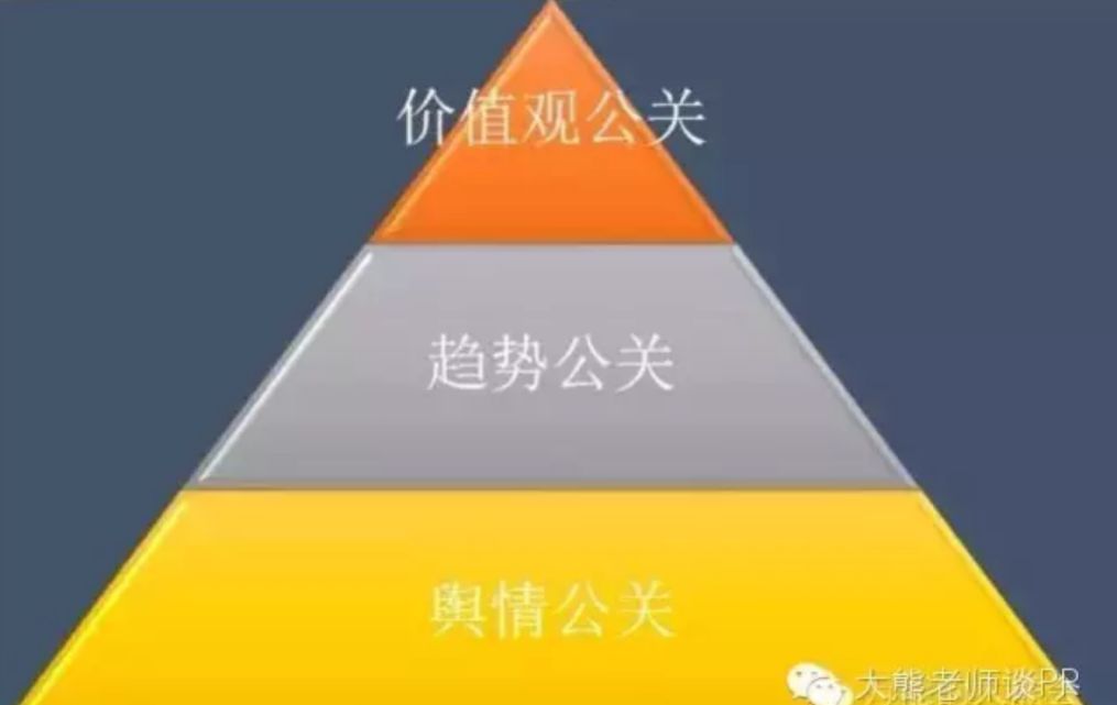 這也是我的一篇老文章,具體不細(xì)說了,大家可以直接看。輿情公關(guān)基本就是應(yīng)激性的公關(guān),只有做事和平事兩個功能,一般缺乏建設(shè)性。到了趨勢公關(guān)就好很多,會有建設(shè)性,主要是鼓吹自己做的事情符合大趨勢的。價值觀公關(guān)是最頂級的公關(guān),就是啥也不談,只談價值觀,比如你想想馬云,他談的事情基本就沒有具體業(yè)務(wù),具體趨勢,具體風(fēng)口。一說下一個風(fēng)口是什么,大家就把張小龍?zhí)С鰜砹?,?dāng)然他不是公關(guān)而是微信的掌門人,但他的公開課,其實(shí)也是一個公關(guān)屬性的操作。