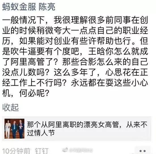 此文引來阿里方面的“打假”。2月15日晚間,微信文章《那個從阿里離職的漂亮女高管,從來不過情人節(jié)》經(jīng)過阿里螞蟻金服陳亮在朋友圈轉(zhuǎn)發(fā)后開始發(fā)酵