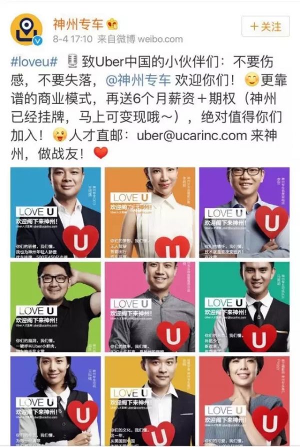 今年8月,滴滴出行收購Uber中國,一統(tǒng)出行市場。面對Uber中國幾百位有用之才,神州專車在微信和微博同時發(fā)布了致Uber中國小伙伴的一封信,言辭中直言對Uber年輕人的欣賞,并要高薪挖角!放出“6個月薪資+期權(quán)”的巨大誘惑。還發(fā)布了一組“LoveU”系列海報。