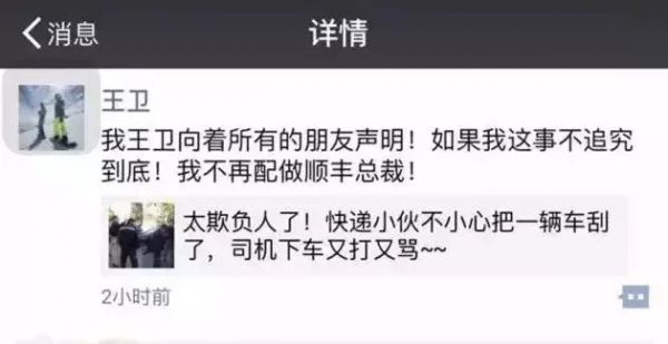 同時,平時一向低調(diào)的順豐總裁王衛(wèi),化身霸道總裁,誓要為被打快遞員討回公道。