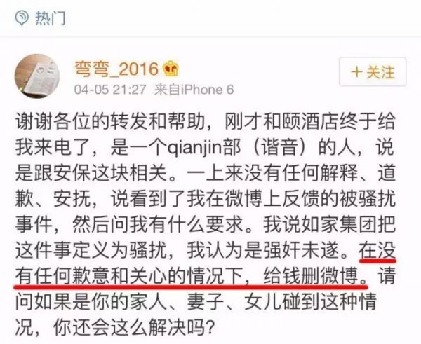 4月5日晚,ID為@彎彎_2016的女子聲稱在北京和頤酒店入住時遭遇陌生男子拖拽劫持,而酒店和警方都不作為,并暗指如家旗下的和頤酒店暗藏賣淫窩點(diǎn)。原微博的轉(zhuǎn)評已達(dá)上千萬。