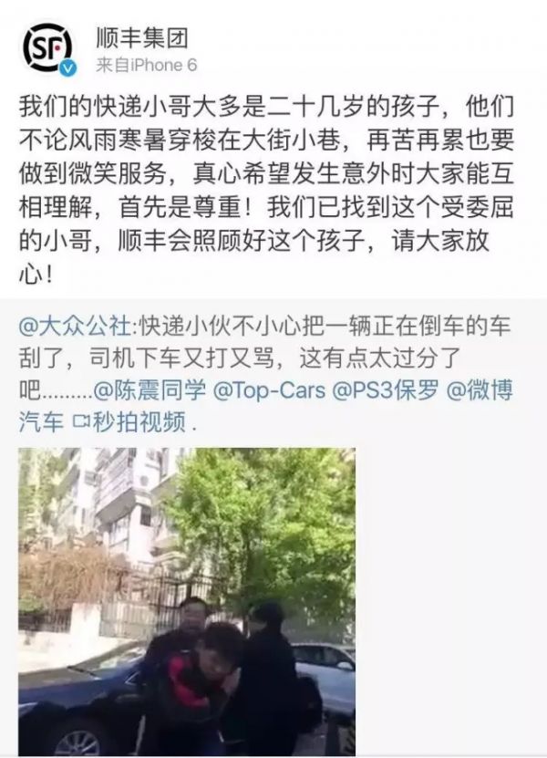 4月17日,有網(wǎng)友在微博爆料,北京一小區(qū)內(nèi),一位順豐的快遞小哥不小心與某私家車發(fā)生刮蹭,該車主隨后對快遞小哥進(jìn)行了長時間的辱罵,并不斷動手打人。在1分42秒的視頻中,這位車主對快遞小哥進(jìn)行了7次打臉,且連續(xù)爆粗口十余次。而快遞小哥除了說一句“對不起”之外,沒有還手,而是一直在躲閃。