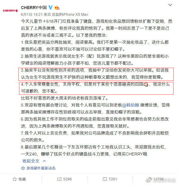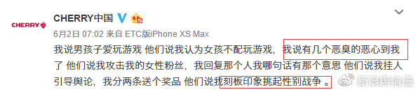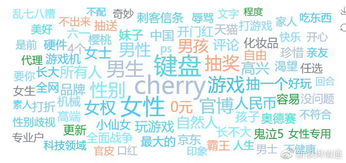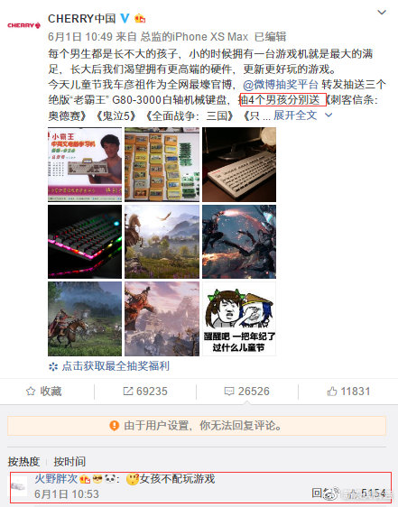 6月1日10時(shí),為了迎合六一兒童節(jié),外設(shè)大廠CHERRY在微博發(fā)起抽獎(jiǎng)活動(dòng),因?yàn)槌楠?jiǎng)文案中特指了中獎(jiǎng)用戶為“男性”,一個(gè)素人妹子問的一句“女孩不配玩游戲”成為這場(chǎng)網(wǎng)絡(luò)輿論大戰(zhàn)的導(dǎo)火索。素人妹子的這條評(píng)論被贊了五千多次,由此網(wǎng)友開始質(zhì)疑CHERRY歧視女性。