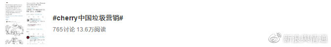 部分輿論認(rèn)為@CHERRY中國 作為官博言辭不當(dāng),掀起民眾仇視女權(quán)者的情緒,為博取流量而惡意營銷,截至6月3日,微博話題#CHERRY中國垃圾營銷#已經(jīng)達(dá)到了13.6萬的閱讀量,引發(fā)了765次的討論。