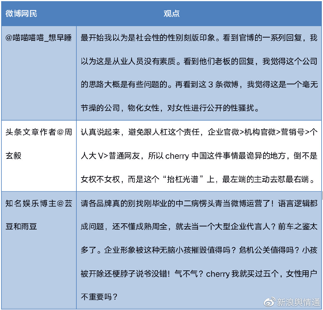 針對(duì)網(wǎng)上質(zhì)疑之聲,@CHERRY中國 接連發(fā)布多條微博“反擊”,表示“部分網(wǎng)民是曲解言論,反對(duì)這種惡意碰瓷的田園女權(quán)者”對(duì)此,輿論觀點(diǎn)一分為二,一方面,部分輿論認(rèn)為“@CHERRY中國 掀起民眾仇視女權(quán)者的情緒,是為了博取流量,且作為官博言辭不當(dāng)”;另一方面,部分輿論認(rèn)為 @CHERRY中國的做法提升了品牌知名度,起到營銷的效果。