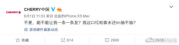6月1日11點(diǎn)03分,CHERRY官博發(fā)博“我給妹子們的口紅和香水還抽不抽了?”