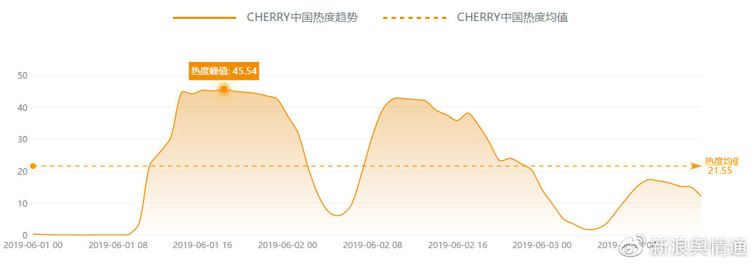 據(jù)新浪輿情通數(shù)據(jù)統(tǒng)計(jì),在6月1日至6月3日期間,“CHERRY事件”全網(wǎng)相關(guān)信息量51萬條。截至3日,#CHERRY中國性別歧視#等相關(guān)話題,總閱讀量為556萬次,討論為7千條。全網(wǎng)熱度指數(shù)趨勢(shì)圖上看,“CHERRY中國”3日內(nèi)熱度指數(shù)均值為21.25,峰值為45.54,經(jīng)分析,熱度峰值出現(xiàn)在6月1日16時(shí),@CHERRY中國 連續(xù)發(fā)布多條微博反擊“田園女權(quán)者”,引發(fā)大量網(wǎng)民轉(zhuǎn)發(fā)討論,是聲量高漲的主要原因。