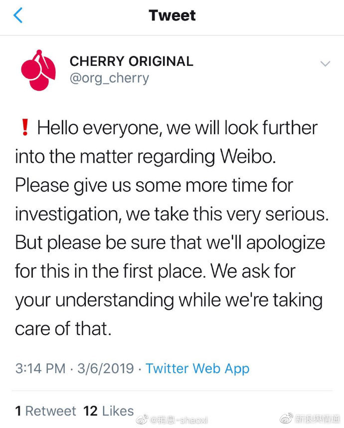 6月3日下午,Cherry總公司推特發(fā)公告“請(qǐng)給我們多一點(diǎn)時(shí)間調(diào)查”