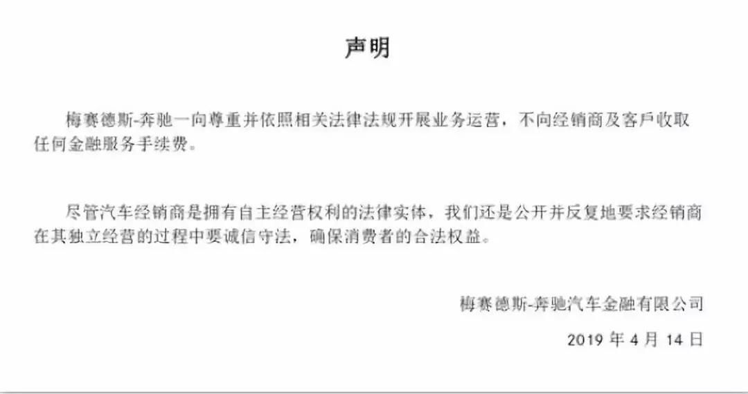 在扯出“金融服務(wù)費”后,梅賽德斯-奔馳汽車金融有限公司在4月14日下午五點,也發(fā)布了一則聲明:表示公司一向依照相關(guān)法律法規(guī),不向經(jīng)銷商和客戶收取任何金融服務(wù)手續(xù)費。