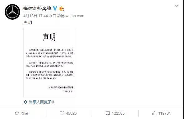 4月13日下午五點,梅賽德斯-奔馳銷售服務(wù)有限公司通過官微首次發(fā)布了聲明。
