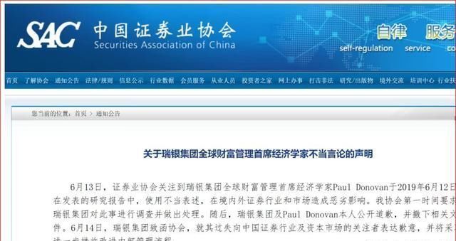 中國證券業(yè)協(xié)會發(fā)表聲明,協(xié)會已將Paul Donovan列為不受歡迎人員,建議會員單位不引用其研究觀點、不邀請其參與相關(guān)活動,并要求瑞銀集團采取有效措施消除不良影響。