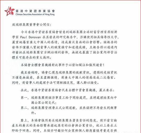 這不是多諾萬個人言論的誤解,這是非常嚴(yán)重的侮辱文字,瑞銀集團對此輕描淡寫,全無悔意。本協(xié)議督促瑞銀集團管理層正式公開道歉,并承諾不再發(fā)生同類事件。本協(xié)會強烈要求瑞銀集團對以上要求立即給予回應(yīng),否則本會將保留追究法律責(zé)任的權(quán)力。