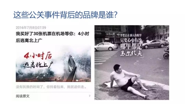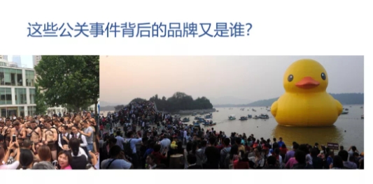 制造熱點是第一階,我們看看這些大家都熟悉的熱點事件。比如,“4小時逃離北上廣”,“只要心中有沙,哪里都是馬爾代夫”,“斯巴達三百勇士北京游行”,“大黃鴨進大陸”。這四個熱點事件很多人聽說過,請問,這些熱點事件背后的品牌是誰呢?
