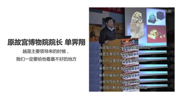 我們看一個超年長網(wǎng)紅——故宮的故事。上一任故宮博物院院長單霽翔先生問:國家領(lǐng)導(dǎo)來故宮視察,怎么報告?