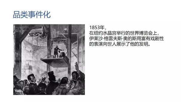 首先,是把品類價值和品類特性表達出來,品類事件化。比如今天的電梯領(lǐng)導(dǎo)者奧的斯,奧的斯先生發(fā)明了“安全電梯”,首次亮相就引發(fā)了轟動。