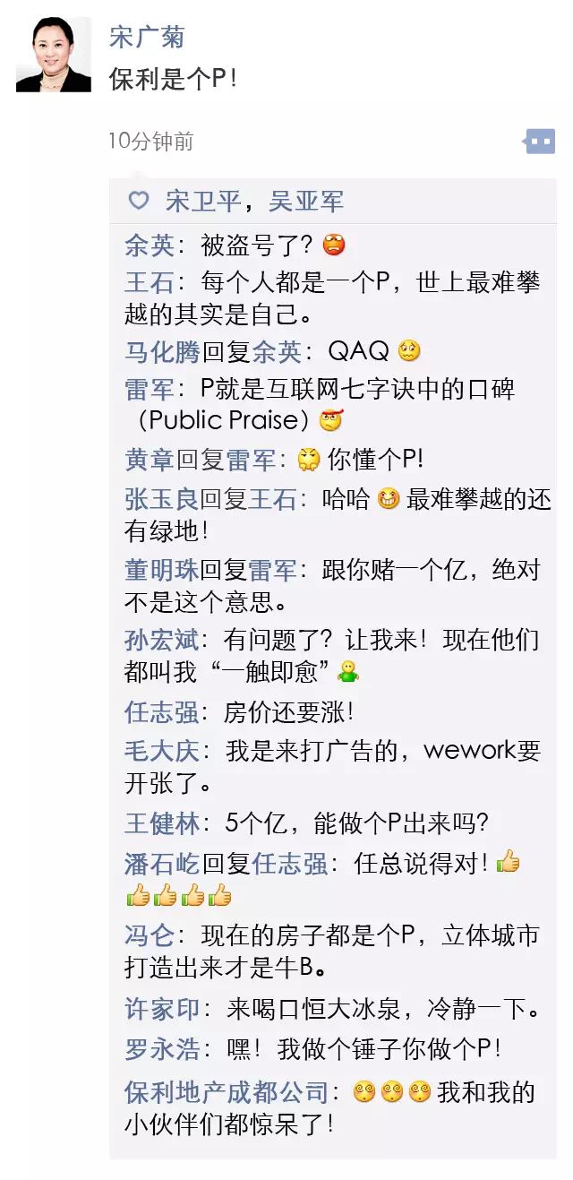 比如前幾年,保利當(dāng)家人宋廣菊微博吐槽:保利是個(gè)p,旋即引發(fā)了外界的一片猜想。雖然后面被證實(shí)是為公司的營(yíng)銷策略,但是保利地產(chǎn)成都公司的公關(guān)反映可謂是滿分,發(fā)了一個(gè)宋廣菊的朋友圈,地產(chǎn)和互聯(lián)網(wǎng)大佬在其朋友圈議論紛紛,看起來毫無違和。