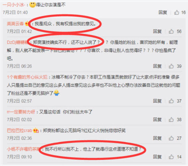 然而就在網(wǎng)友評價這部電視劇以及鄭爽演技的時候,粉絲就如同裝了雷達一樣迅速跑到第一現(xiàn)場,一來就指責(zé)網(wǎng)友沒看劇本身,而當(dāng)觀眾表明自己有看的時候,他們就開始那一套言論:你行你上???你會演嗎?有什么資格說鄭爽?