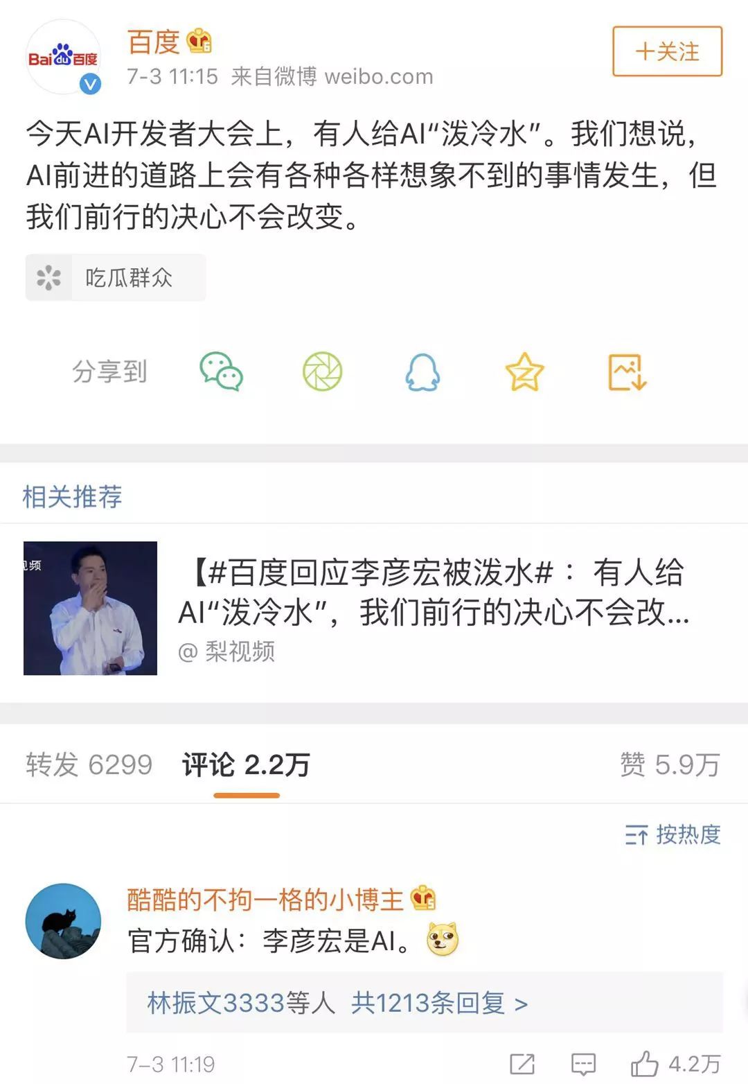 對(duì)于百度來說,這是一次失敗的危機(jī)公關(guān)范例。在百度的官方聲明中提到“今天AI開發(fā)者大會(huì)上,有人給AI‘潑冷水’”,并未對(duì)甚囂塵上的“聯(lián)手炒作”陰謀論給出回應(yīng),最高贊評(píng)論為“官方認(rèn)證,李彥宏是AI”。目前在百度圖片里,已經(jīng)無法搜索李彥宏被潑水照片。