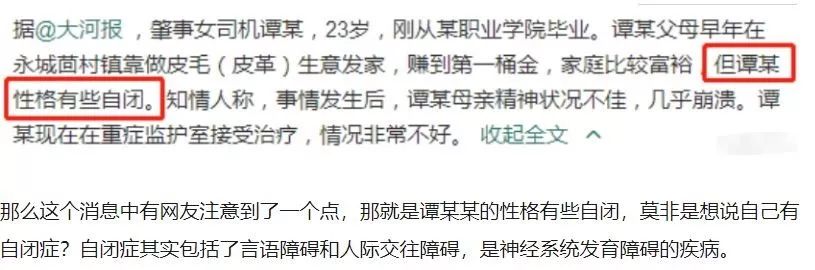 唯一能和“精神疾病”沾上一點關(guān)系的,是此前有媒體調(diào)查發(fā)現(xiàn)的女車主譚某“性格有些自閉”,被有些網(wǎng)友懷疑是想以自閉癥為借口脫罪。