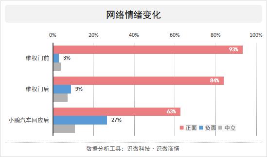 通過識微商情監(jiān)測工具分析,可以看到在“維權門”之前,小鵬汽車網(wǎng)絡好感度挺高的,正面情緒占比高達94%;在維權門爆出之初,正面情緒下降到84%;待到小鵬汽車發(fā)出公開信后,正面情緒已經(jīng)降到63%,負面情緒較最初占比上升了9倍。