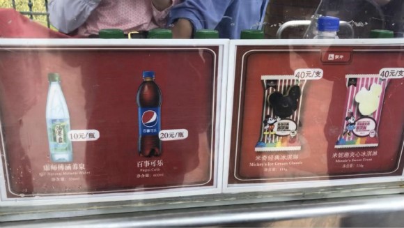 記者入園后發(fā)現(xiàn),基本每隔幾米就有銷售食品飲料的餐車及店鋪,一瓶礦泉水標(biāo)價(jià)10元,一瓶可樂20元,一支冰淇淋40元,爆米花35元一盒。