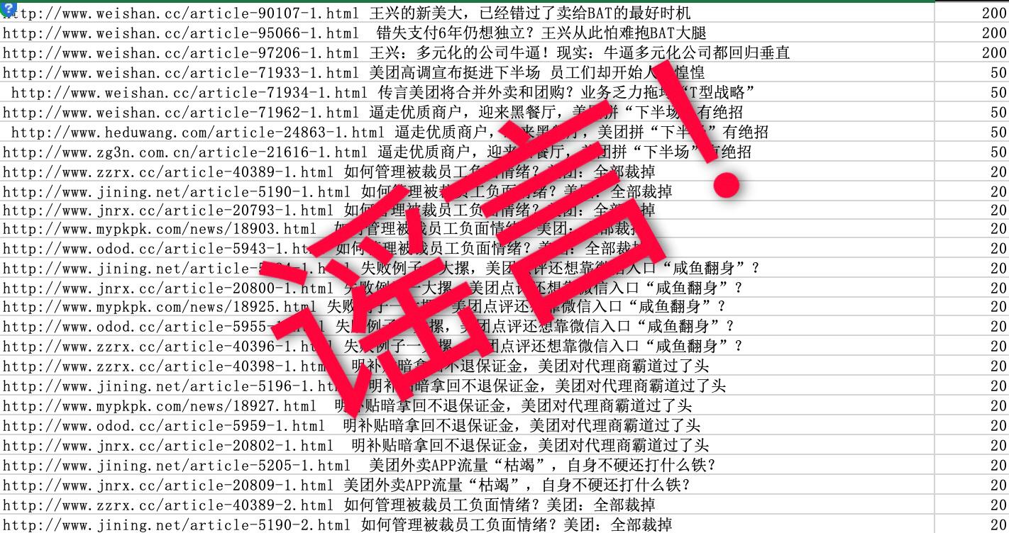 從警方提供給美團(北京三快在線科技有限公司)的調證材料中看,涉案人員針對黑稿制定了嚴密的價目表,標題含有王興的黑稿首發(fā)每篇收費200元,轉發(fā)稿件每篇收費50元,標題含有美團的文章每篇收費僅為20元。