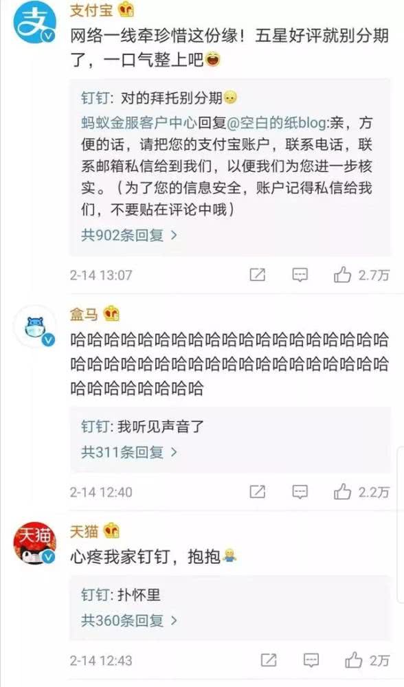 僅僅是自己求饒還不夠,為了博得少俠們原諒,釘釘甚至祭出大招,搬出“家長”:“給我在阿里粑粑家留點面子吧!”支付寶、天貓、淘寶等家族大佬也紛紛應(yīng)援,“五星好評就別分期了,一口氣整上吧”“心疼我家釘釘,抱抱”“不愛就不愛,請不要傷害,哈哈哈哈哈”“大家看在我的面子上給小釘多打兩顆星吧”……
