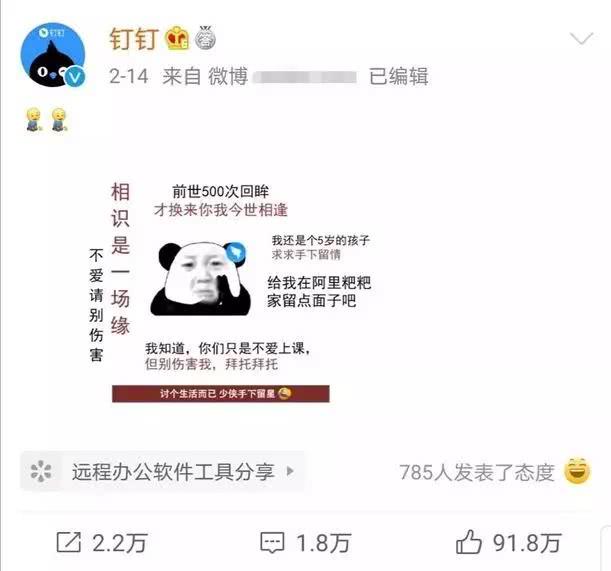 2月14日情人節(jié),釘釘沒有和CP互動發(fā)狗糧,而是給廣大中小學(xué)生“跪了”,用官方P圖求饒:“前世500次回眸,才換來你我今世相逢”“我還是個5歲的孩子,求求手下留情”“我知道,你們只是不愛上課,但別傷害我,拜托拜托”“討個生活而已,少俠手下留星”……