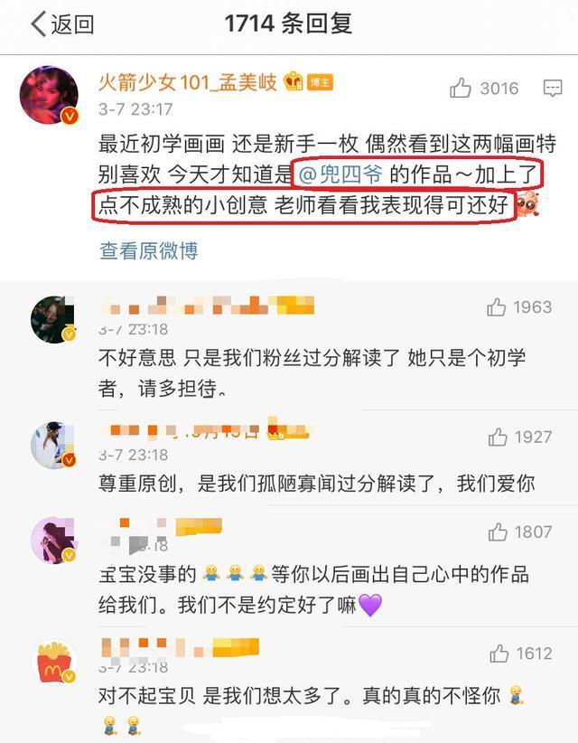 你看孟美岐的粉絲,就是老老實實地認錯。 “不好意思,只是我們粉絲過分解讀了,她只是個初學(xué)者,請多擔(dān)待。”“尊重原創(chuàng),是我們孤陋寡聞過分解讀了,我們愛你!”